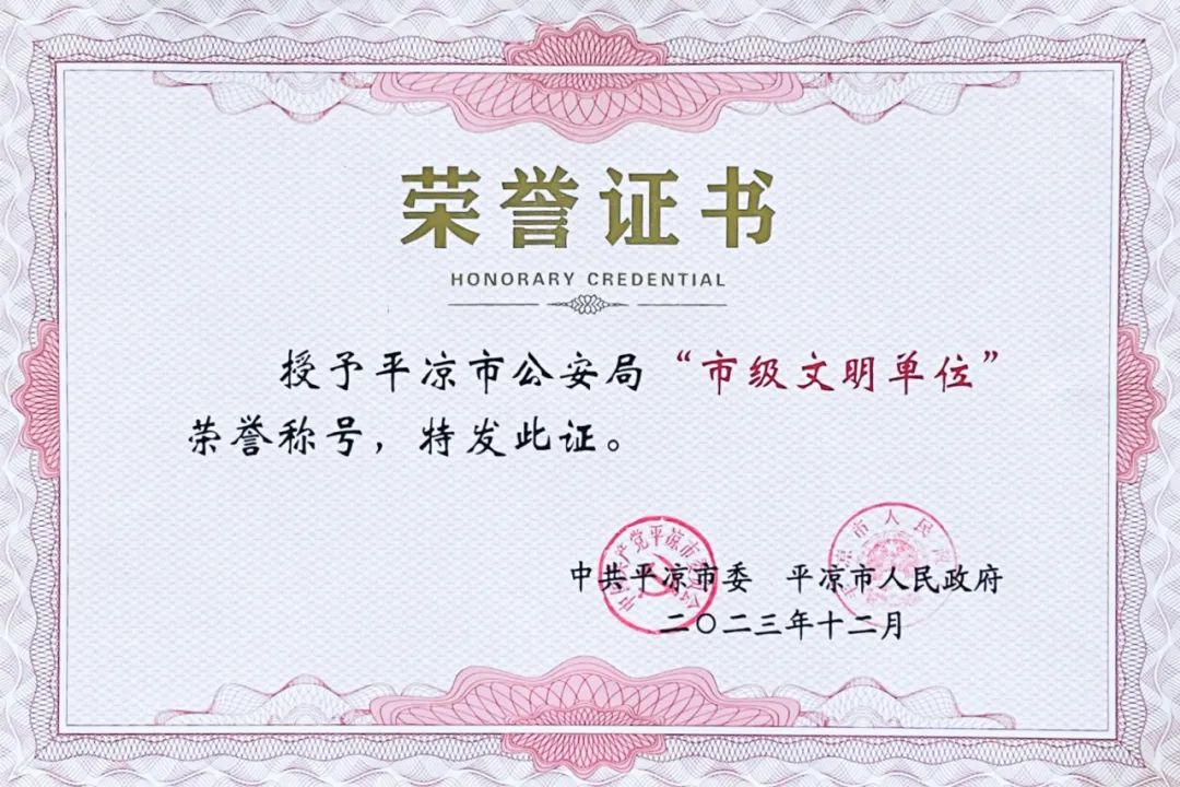 近日,市委、市政府授予平凉市公安局“市级文明单位”荣誉称号。