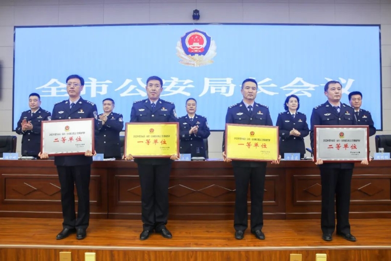 会议为2022年县市区公安机关重点工作绩效考评一等、二等单位颁奖。