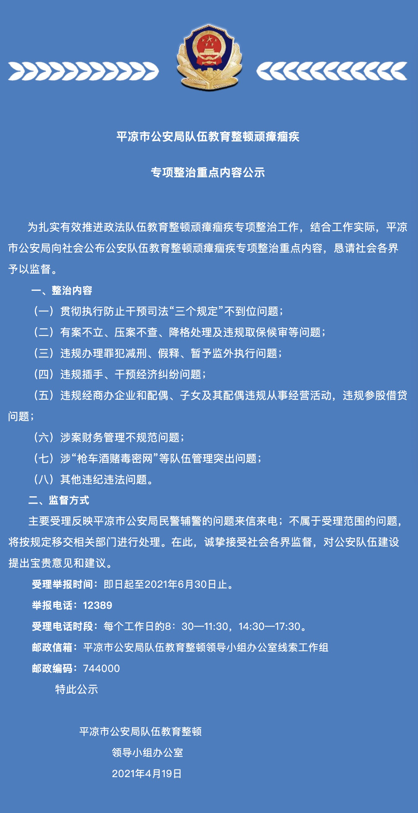 平凉市公安局队伍教育整顿顽瘴痼疾专项整治重点内容公示