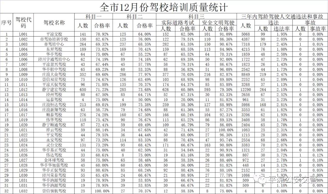为切实加强道路交通安全源头管理,提升机动车驾驶人考试工作力度,强化培训和考试质量监督,按照《机动车驾驶证申领和使用规定》(公安部139号令)要求,平凉市公安局交警支队现将全市驾驶培训机构2021年12月份的考试合格率、三年内驾龄驾驶人交通违法率和交通肇事率公布如下: