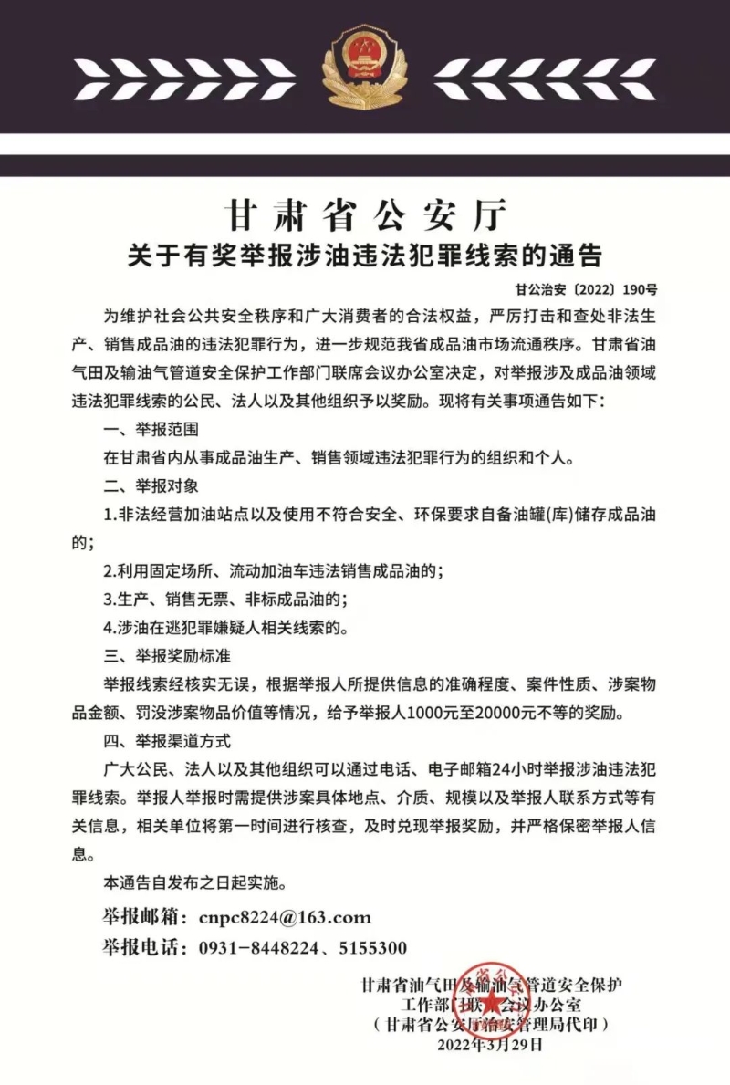 关于有奖举报涉油违法犯罪线索的通告