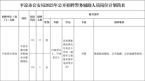 本次计划招聘辅警18名,其中男性15名、女性3名。招聘岗位及条件详见附件:《平凉市公安局2023年公开招聘警务辅助人员岗位计划简表》。