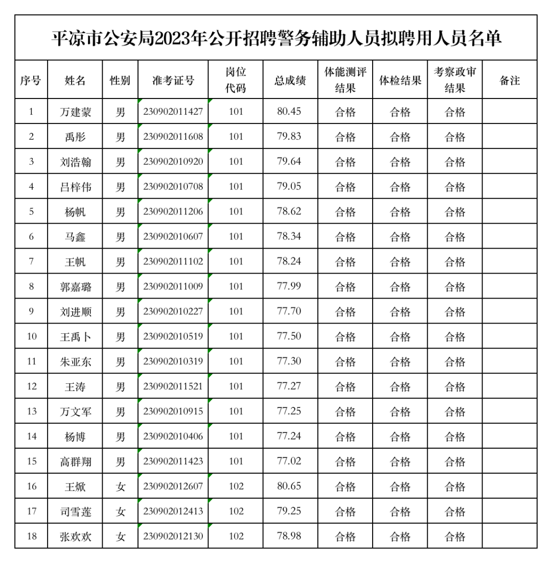 按照《平凉市公安局2023年公开招聘警务辅助人员公告》,经网上报名、资格审查、笔试、面试、体能测评、体检和考察政审等程序,确定万建蒙等18名为拟聘用的警务辅助人员。同时,按照总成绩排名(体能测评合格),确定翟相如等14名人员拟进入后备库。现将拟聘用的警务辅助人员和进入后备库人员的有关情况予以公示,接受社会监督。如发现有影响聘用等问题,可通过电话、来信和面谈等形式反映,我们将认真受理,并向署名或当面反映问题的人员反馈调查核实结果。如不存在影响聘用的问题,将按有关规定办理聘用手续。进入后备库人员,待岗位空缺时,按程序进行体检、考察政审并补充聘用。