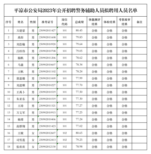 人员名单详见附件1:平凉市公安局2023年公开招聘警务辅助人员拟聘用人员名单。