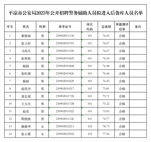人员名单详见附件2:平凉市公安局2023年公开招聘警务辅助人员拟进入后备库人员名单。