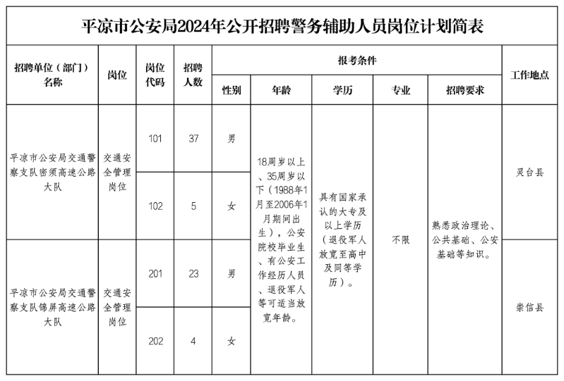本次计划共招聘辅警69名(男性60名、女性9名),其中平凉市公安局交警支队密须高速公路大队42名(男性37名、女性5名)、平凉市公安局交警支队锦屏高速公路大队27名(男性23名、女性4名)。招聘岗位及条件详见:《平凉市公安局2024年公开招聘警务辅助人员岗位计划简表》(附件)。
