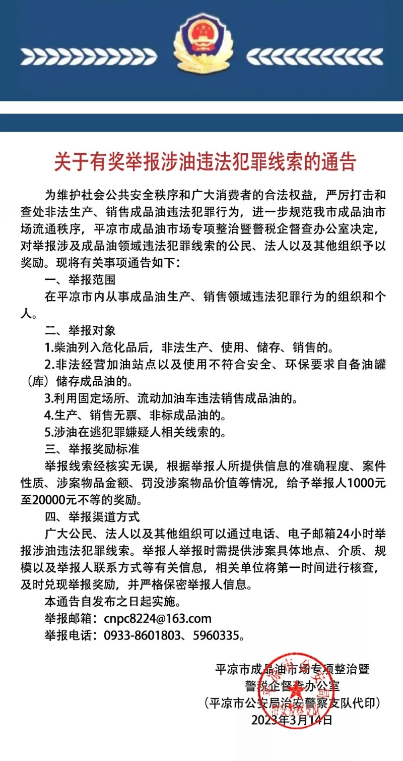 关于有奖举报涉油违法犯罪线索的通告