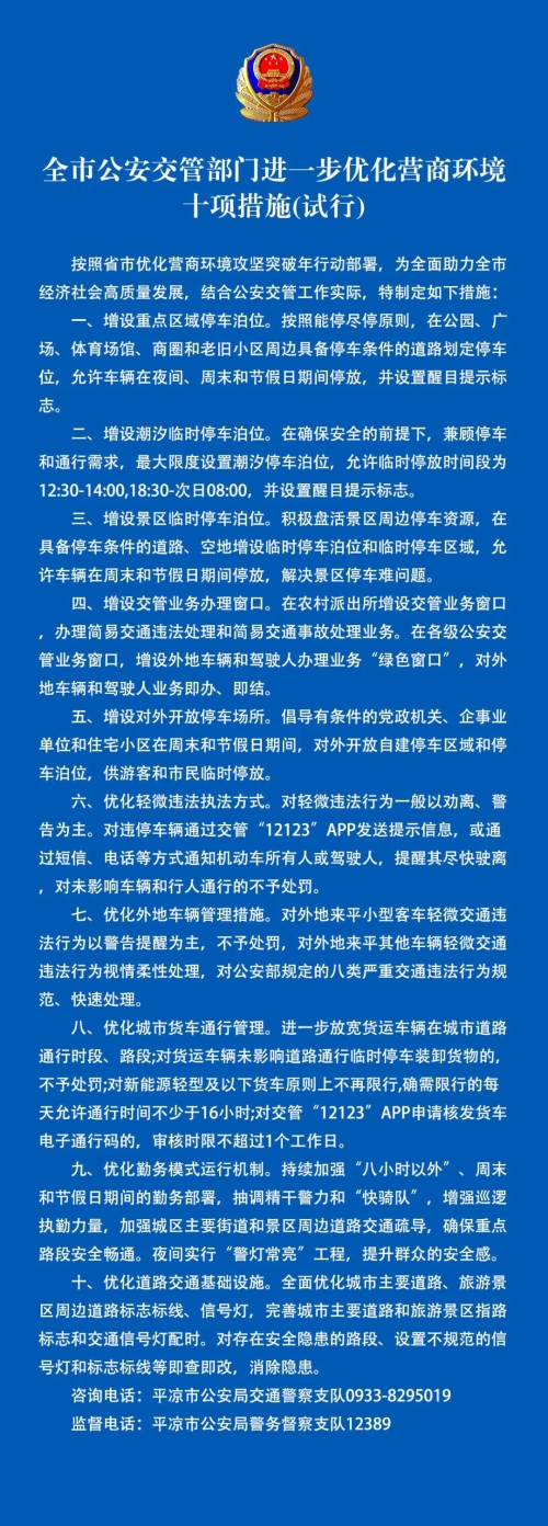 平凉市公安交管部门进一步优化营商环境十项措施(试行)