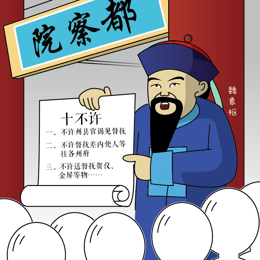 君子正人先正己,正己而后正风气。魏象枢任都察院左都御史后,第一道奏疏就提出了整治腐败的“十不许”:“一不许州县官谒见督抚;二不许督抚差内使人等往各府州;三不许送督抚贺仪、金屏等物……”“十不许”,从整顿官场风气着眼、从清理官场陋习入手,足见魏象枢的胆识和才干,康熙对他大加赏识,贪官们也心生畏惧而大为收敛。