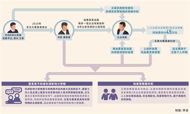 经查,2019年,时任B市公安局党委书记、局长的王某多次与司机惠某某商议,由惠某某出面联系一些企业老板投标B市公安系统的工程项目,王某则利用职务便利协调关系帮助相关老板中标,再由惠某某出面向老板收取好处费并保管,二人以此方式收受3名企业老板好处费共计45万元。在此过程中,王某和惠某某分工明确,王某利用职务便利在幕后协调关系,惠某某负责出面具体操作,二人共享好处费。王某与惠某某就上述违法行为存在事前通谋,王某对惠某某寻找企业老板投标相关项目并收受好处费的情况不仅主观明知,且自始至终积极参与其中,并非不知情或纵容、默许惠某某利用王某职权谋取私利。综上,王某和惠某某有共同的犯罪故意和行为,二人属于典型的共同受贿犯罪。