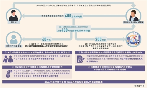 其中,2009年至2010年,何立祥利用职务上的便利,为某建材公司负责人杨某某(2000年认识,关系密切并互相信任)在工程款拨付等方面提供帮助,杨某某表示要送给何立祥400万元好处费,基于对杨某某的信任,何立祥约定上述400万元由杨某某代为保管,需要使用时再通知杨某某。2009年9月,杨某某根据何立祥安排,将其中200万元转入以杨某某名义开设的股票账户供何立祥实际操控。2019年4月,何立祥的下属曾某向何立祥借款40万元,何立祥安排杨某某将40万元转给曾某。