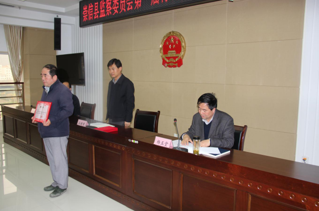 县纪委副书记、县监委副主任杨福泰宣读了《崇信县监察委员会关于聘请第一届特约监察员的决定》,县委常委、县纪委书记、县监委主任冯建君向特约监察员颁发了聘书,并作了讲话。