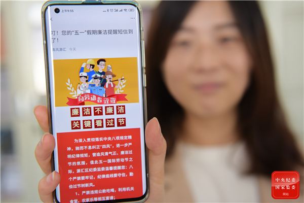 河南省漯河市源汇区纪委监委通过公众微信号、手机短信等平台发送廉政提醒信息,要求广大党员干部廉洁过节。(河南省漯河市源汇区纪委监委 尤亚辉 摄)