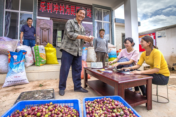 云南省牟定县江坡镇的扶贫产业“三华李”喜获丰收,勤劳的村民看着一筐筐上秤交售的果实和手中的“收获”,脸上洋溢着丰收的喜悦。据悉,该镇现已种植“三华李”4000余亩,为贫困群众建立了稳定的增收渠道。(云南省牟定县纪委监委供 李光洪 摄)