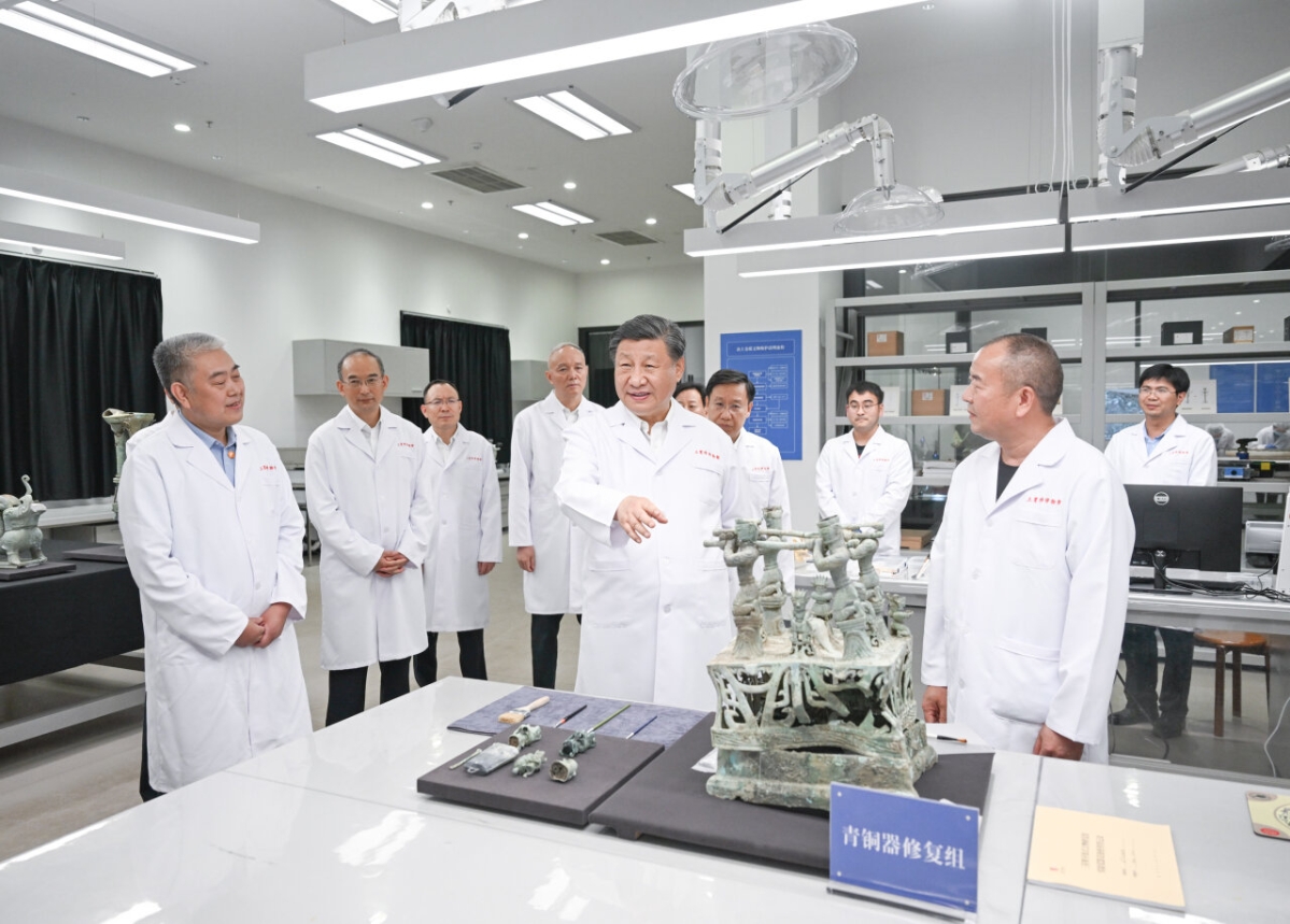 7月25日至27日,中共中央总书记、国家主席、中央军委主席习近平在四川考察。这是26日下午,习近平在位于德阳市广汉市的三星堆博物馆文物保护与修复馆,同现场工作人员亲切交流。新华社记者 谢环驰 摄