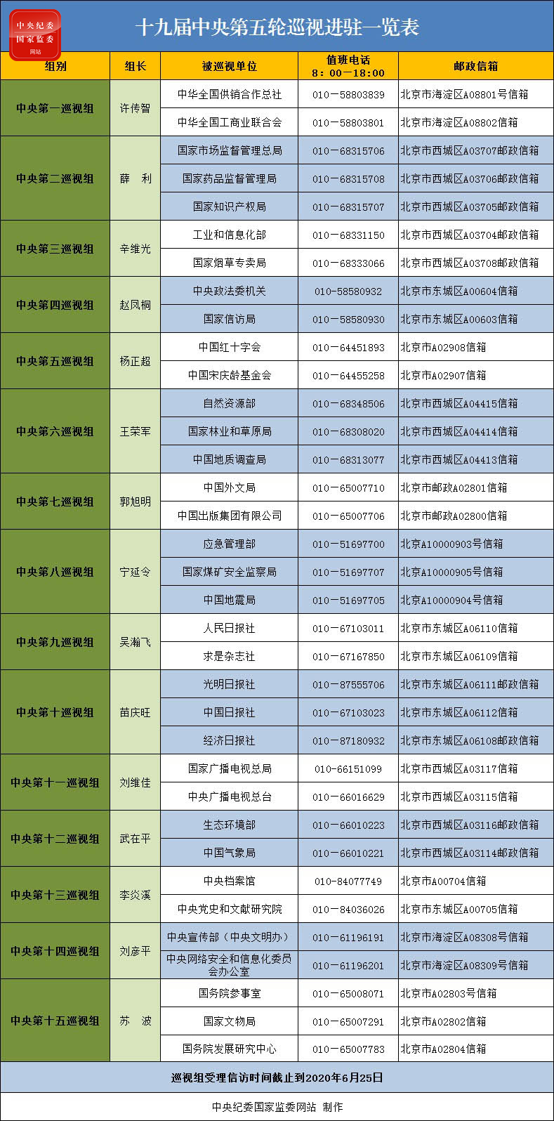 十九届中央第五轮巡视进驻一览表