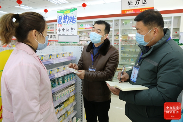 江苏省高邮市委第三巡察组对第二人民医院开展常规巡察,本着发现问题解决问题的原则,全面落实外防输入、内防反弹,为医院平安建设做好坚强的纪律保障。图为巡察组工作人员就相关问题情况与药店工作人员核实。(江苏省高邮市纪委监委 谭倩 摄)