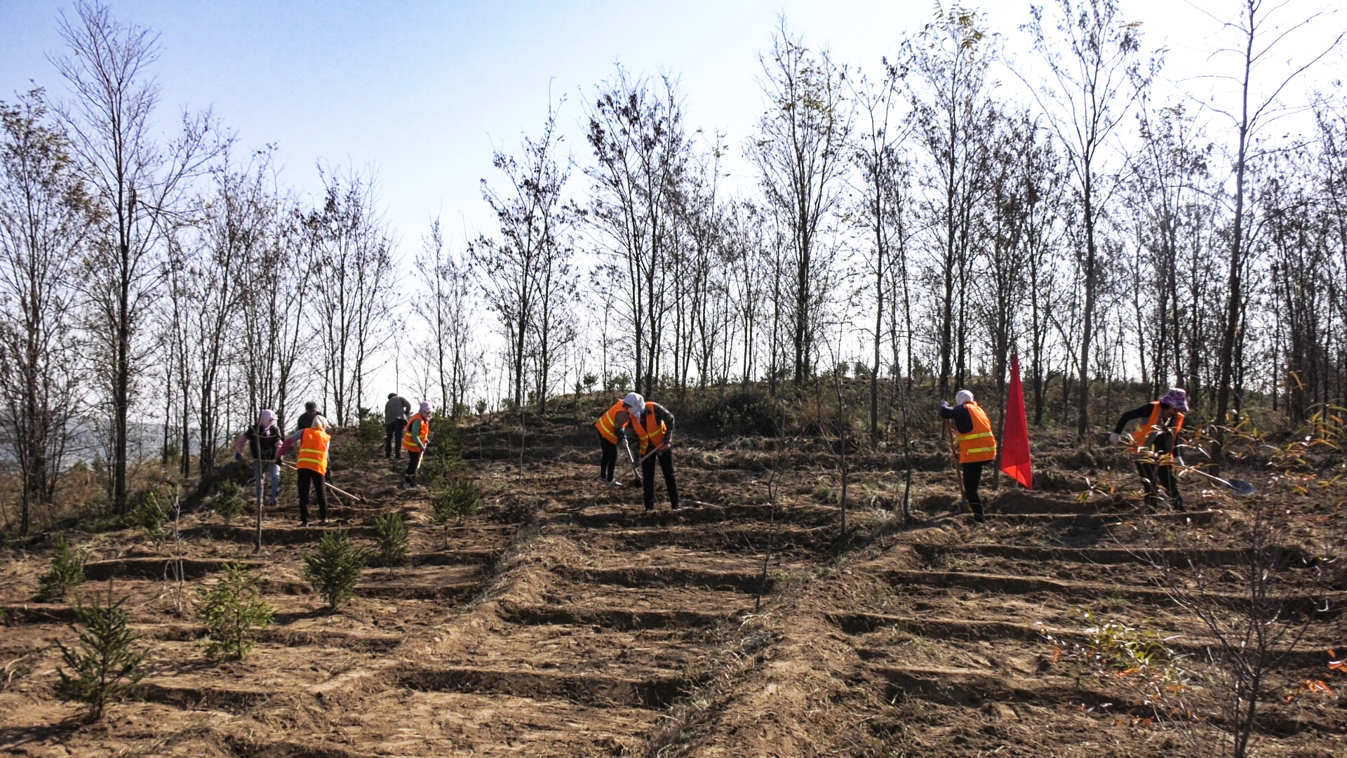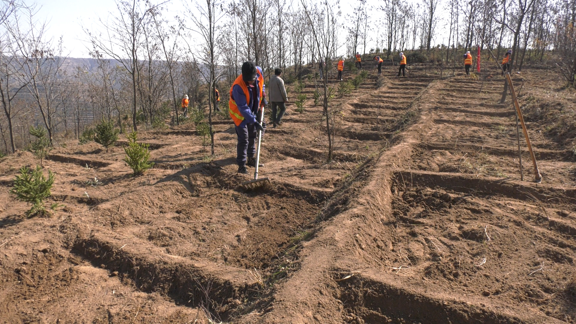 秋风萧瑟,层林尽染。在锦屏镇杜家沟面山和黄花乡铁家沟造林现场,工人们正在前期开挖修整的鱼鳞坑内,井然有序地开展着栽苗、覆土、浇水等工作,大家尽心尽力植新苗、誓为荒山披绿装。