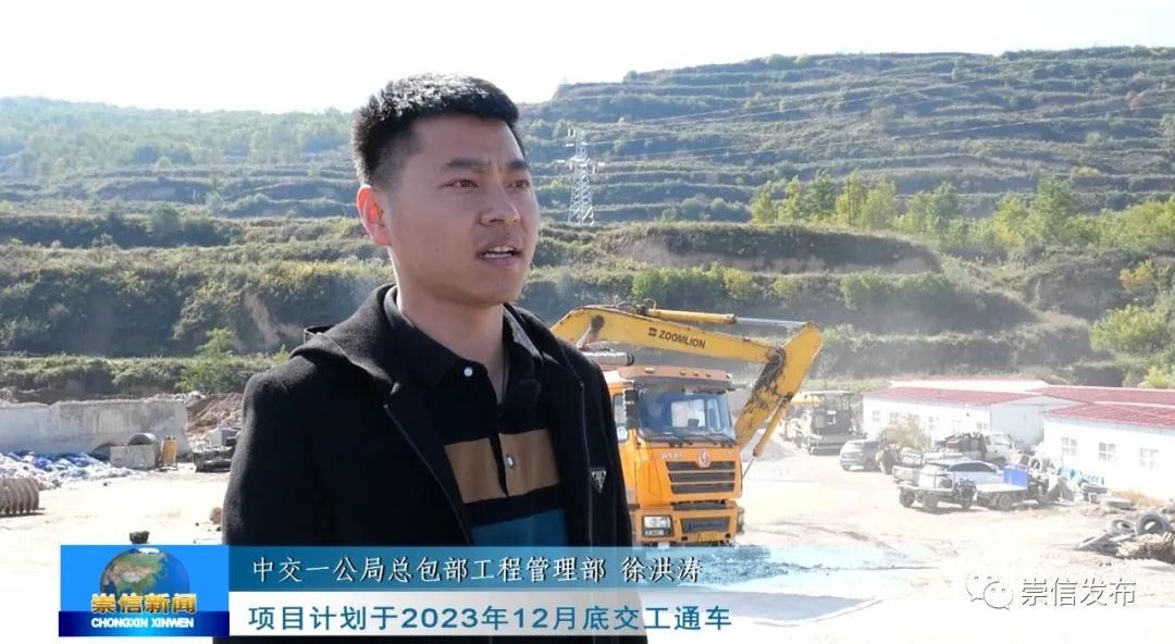孙悦出镜:我现在所在的位置是S28 灵华高速崇信段崇信西收费站的施工现场,灵华高速崇信段总长25.4公里,预计年底建成通车。