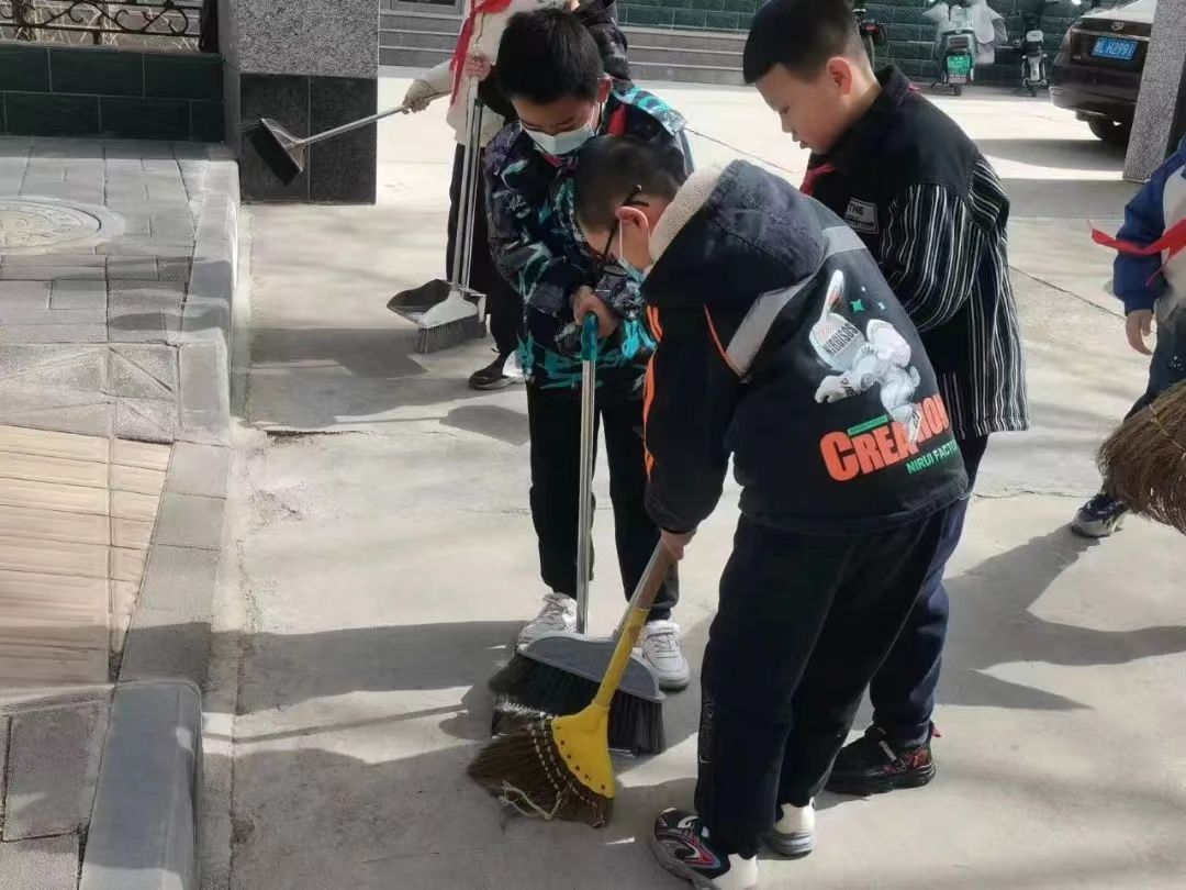 在学校和周围广场,佩戴红领巾、手拿笤帚、簸箕、夹子的小学生正在清理捡拾路边塑料小片、枯败掉落树枝、生活垃圾捡拾垃圾。
