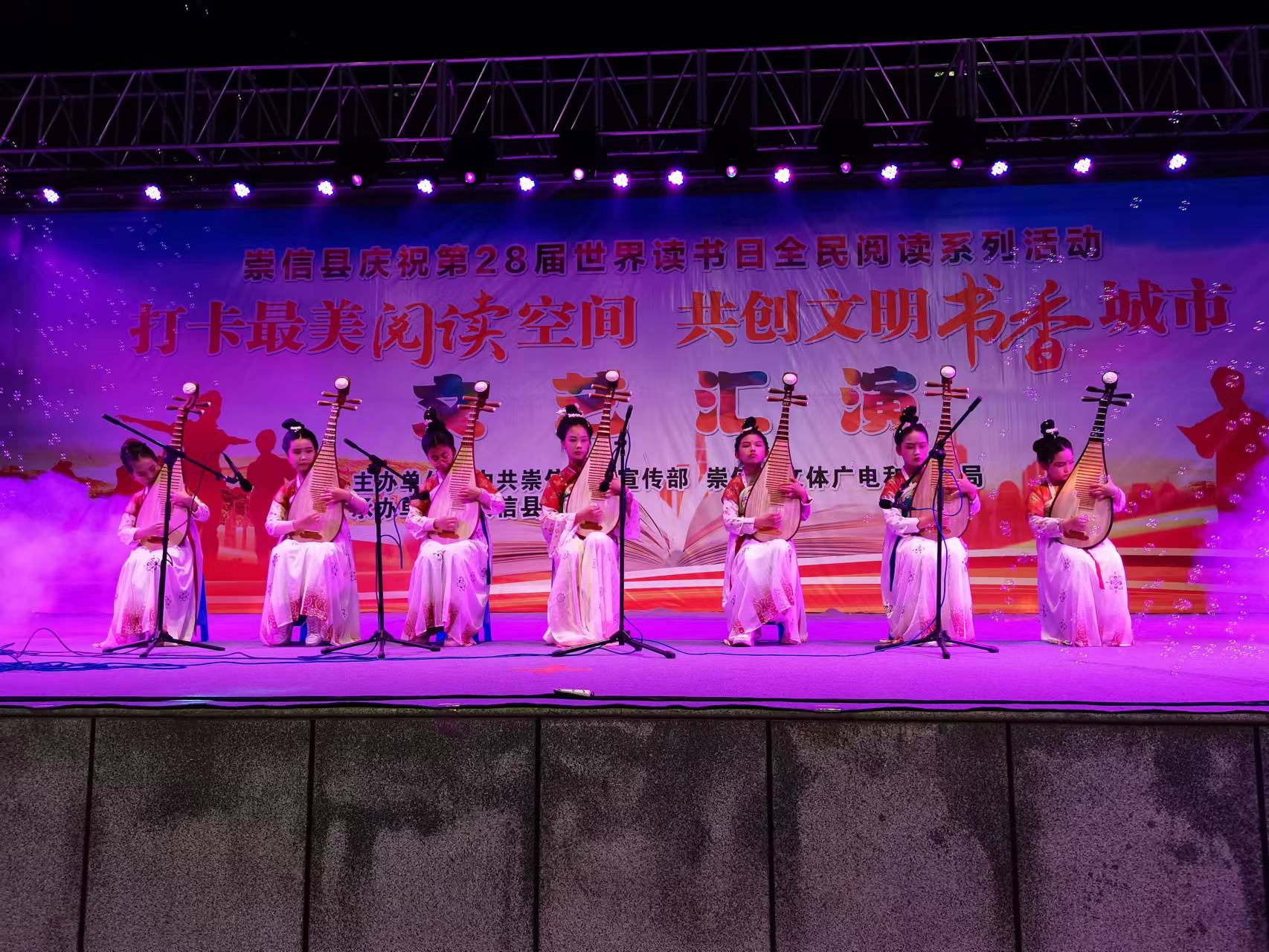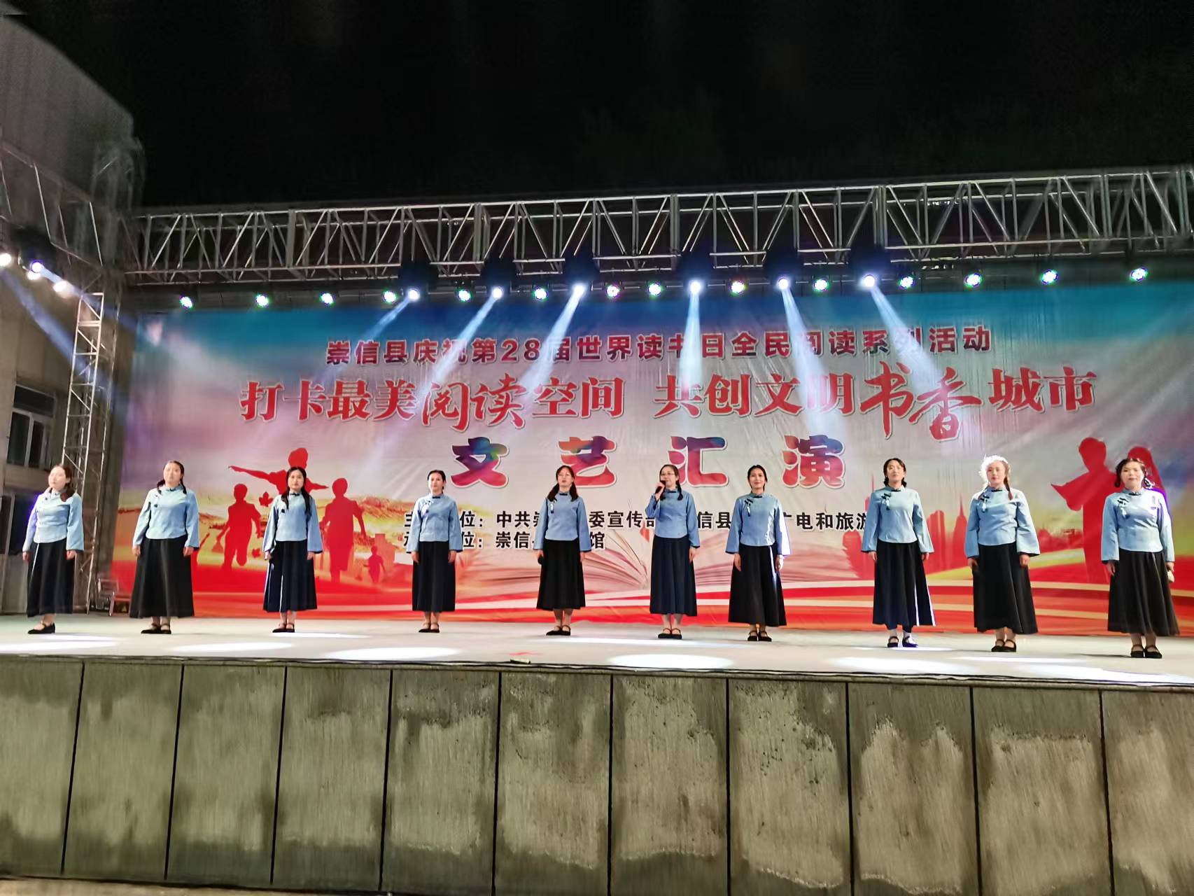 为庆祝第28个“世界读书日”,传承耕读文化,推动全民阅读工作深入开展,持续建设书香崇信,4月24日晚,由中共崇信县县委宣传部、崇信县文体广电和旅游局主办,崇信县图书馆承办的“打卡最美阅读空间·共创文明书香城市”文艺汇演活动在李元谅广场精彩上演。