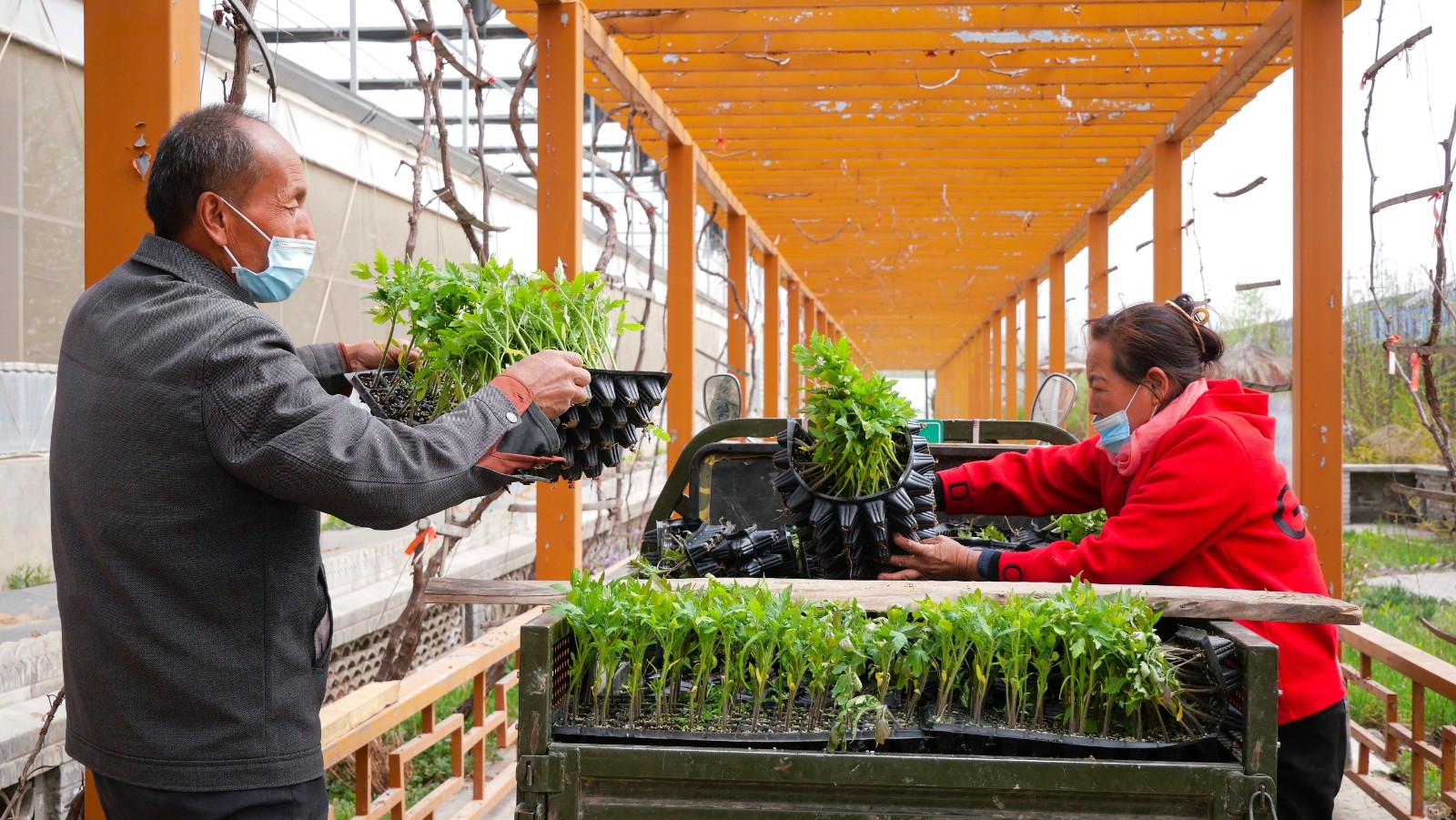 锦屏镇九功村农户韩莲琴说:“我是锦屏镇九功村人,家里有五个蔬菜大棚,今天来东庄村领菜苗,40盘辣椒、10盘西红柿、10盘黄瓜、10盘茄子。”