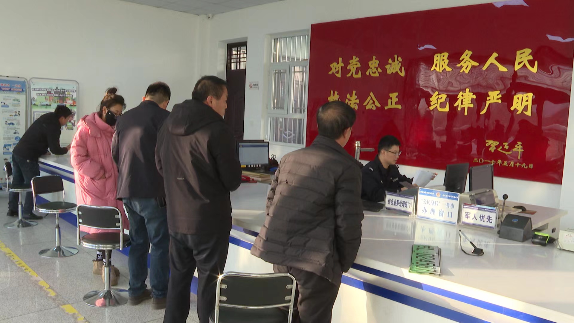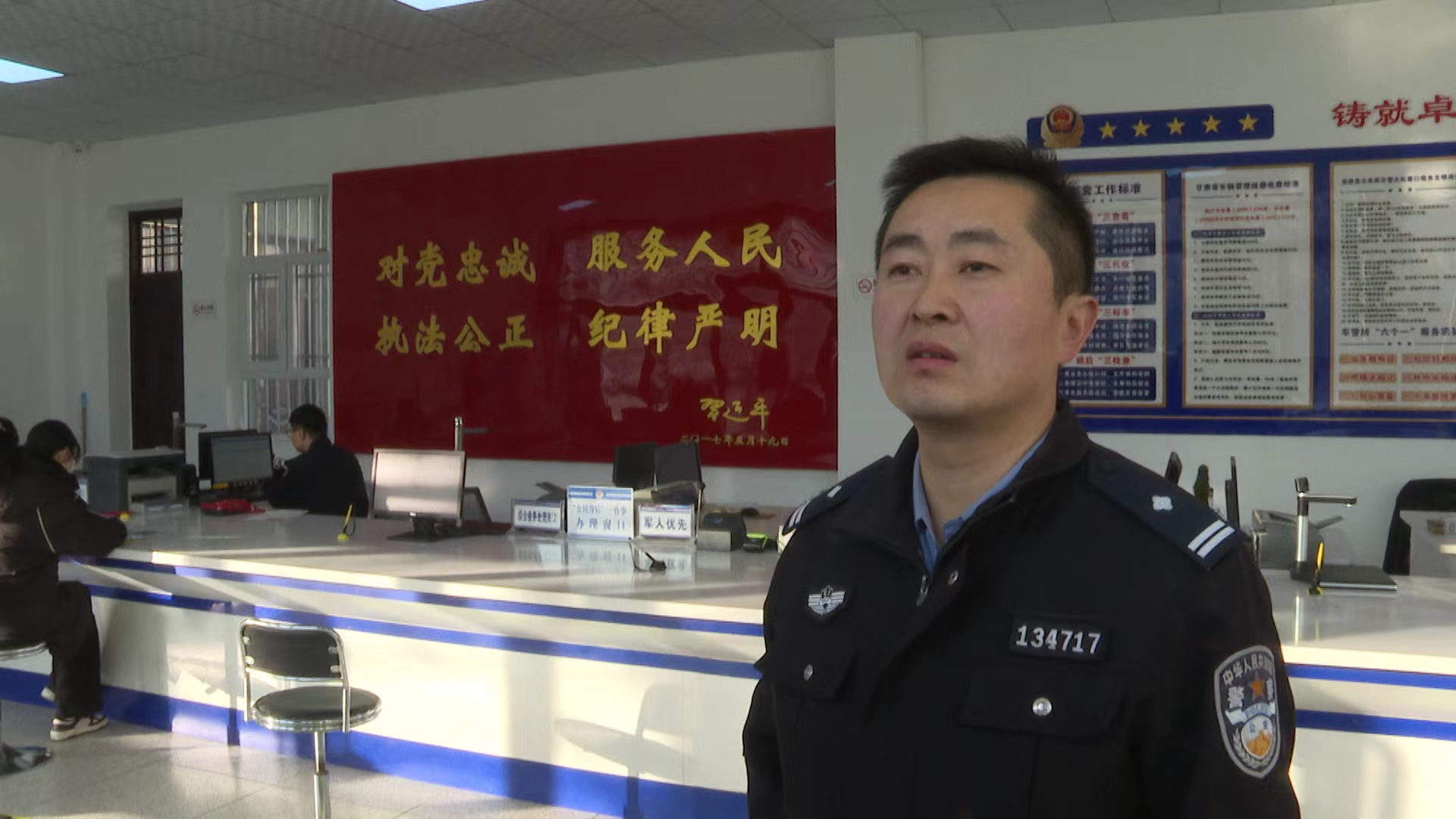 新年上班首日,记者走进崇信县公安局交警大队车管业务大厅,前来办理驾驶证换证、新车上牌等手续的群众络绎不绝。窗口民警主动询问办事群众的业务需求,解答群众咨询、介绍办理流程,验车通道工作人员细心地查验新车,打开车辆引擎盖,检验车架号以及发动机号与资料上的数据是否一致,并对新车进行拍照、登记……他们分工明确有序,全力为群众提供优质便捷的服务。