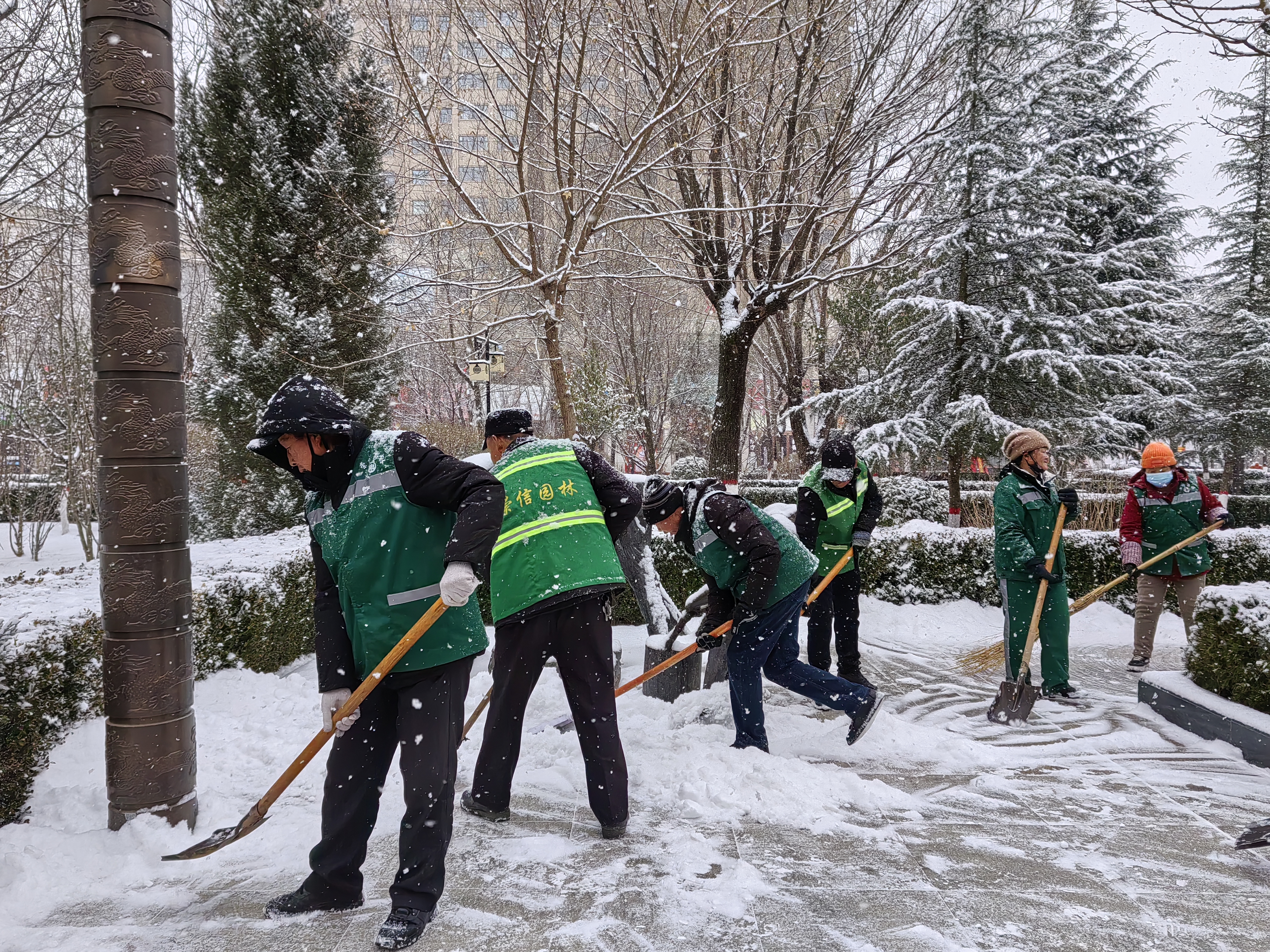 记者在公刘园看到,几十名园林环卫工人他们冒着严寒,挥舞着扫帚和铁锹,正在清扫积雪,为市民清扫出一条条通行的道路。