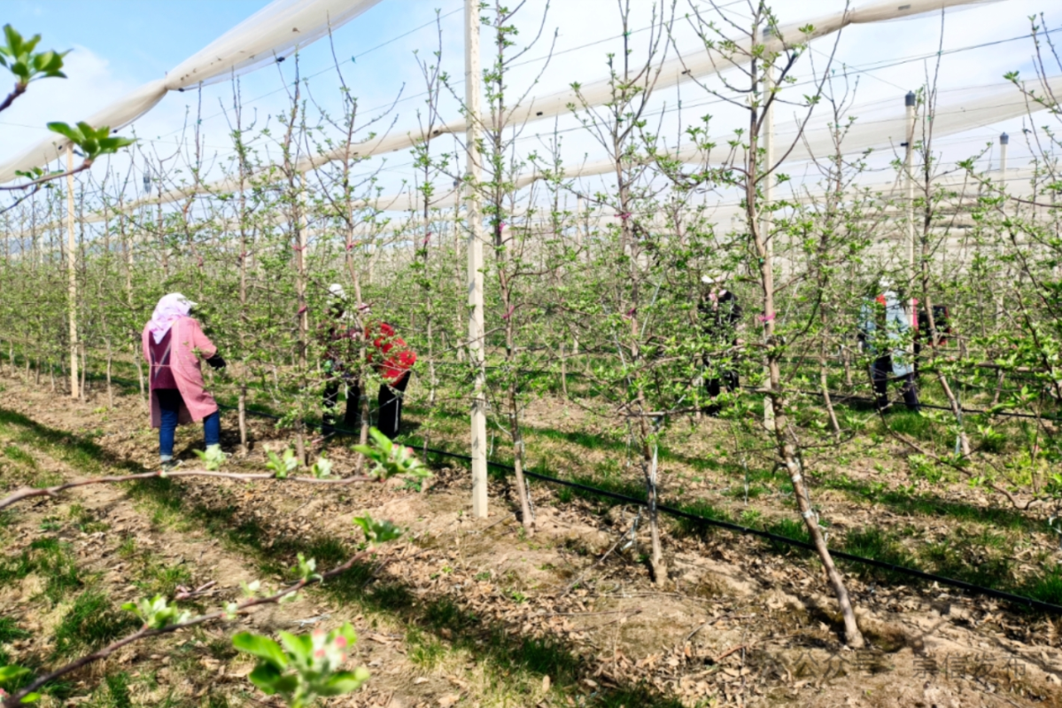 果园务工群众薛巧玲说:“我们每天的工作内容就是果树花前复剪,一个工人每天剪的量是2亩左右。”