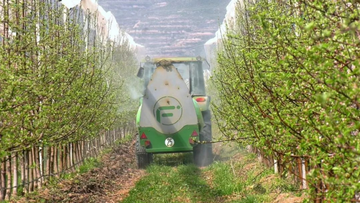 4月11日,记者在铜城塬子高标准矮化密植苹果园看到一棵棵苹果树舒展着嫩绿的枝叶,灰褐色的枝头上长满了一个个白里透红的小花蕾,一阵微风吹来,小花蕾在风中摇曳生姿。苹果树下工人们正在给果树疏花、剪枝,他们分工有序,一辆绿色的弥雾车来回穿梭在果树间,将药肥均匀喷洒在枝叶上,为果树丰产奠定坚实的基础。