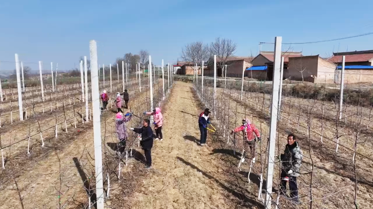 出镜记者陈文翠:一年之计在于春,果树管护正当时。我身后是黄寨镇甘建投矮化密植园,大家可以看到工人们正在紧张忙碌的进行修剪、拉枝、施肥等工作,现场呈现出一派人勤春来早的农忙景象。