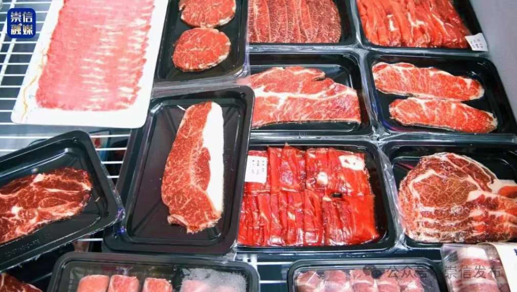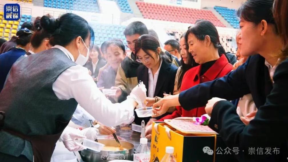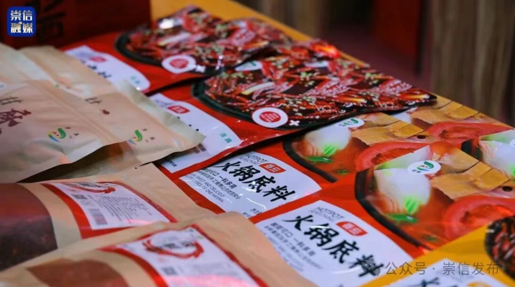 牛产业展区内热闹非凡,展台上的火锅沸腾着,红油汤底翻涌着红亮的浪,牛油香与骨汤鲜气缠成一团,挤满了试吃的人群。周围展架上,摆满了雪花牛肉切片、芮和香、崇甄牛肉等制品,印证着崇信特色养殖产业的扎实根基。