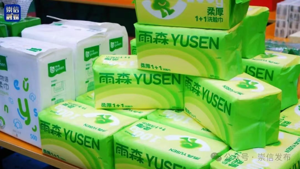 纸制品、豆制品展区内,雨森各类生活用纸组成精致的展示区,抽取式面纸、卷纸、厨房用纸等一应俱全,质感各异的纸质品与旁边豆香浓郁的油豆皮、腐竹相映成趣。