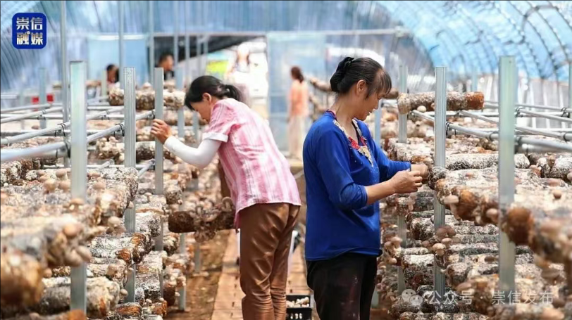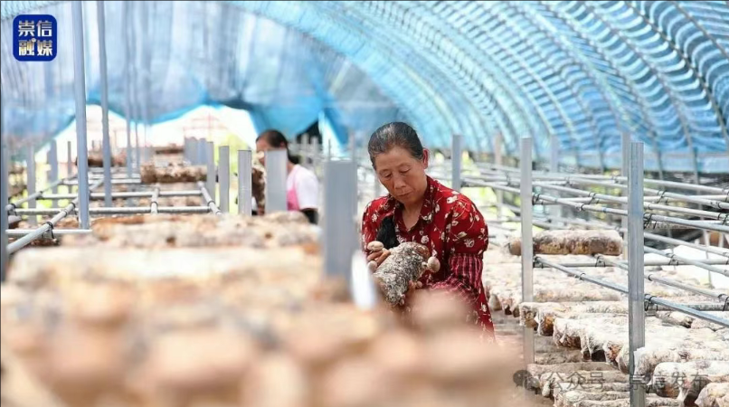 盛夏时节,走进木林乡木林村食用菌种植基地,标准化大棚鳞次栉比,一排排菌包整齐地排列着,菌包开口处,一朵朵圆润饱满的香菇从菌棒中探出脑袋,长势喜人。工作人员正忙着采摘这些丰收的果实,她们娴熟地用手掐住菇根,轻轻一扭,整朵蘑菇就从菌包上脱落,然后装入筐中,现场呈现出一幅丰收的繁忙景象。