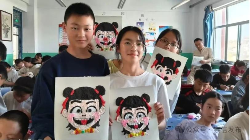 活动最后,学生们化身“手工达人”,用卡纸、彩泥等材料制作哪吒卡通戳戳画,通过牙签雕刻出凹凸的颗粒感,孩子们在专注创作中体验艺术之美。