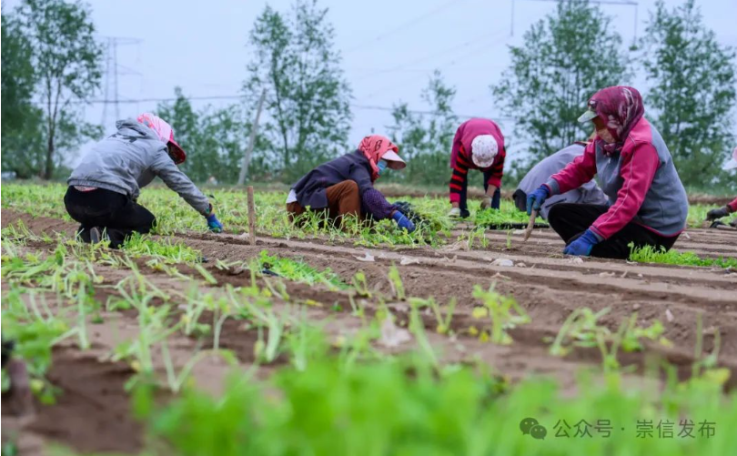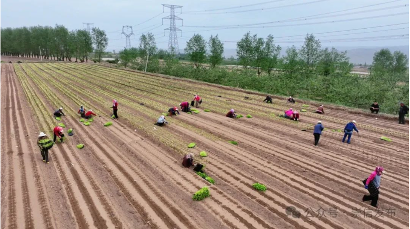 初夏时节,崇信县柏树镇的田野奏响就业增收“协奏曲。”随着2000亩露地蔬菜进入移栽旺季,360余名周边村民变身"产业工人",在家门口实现就业增收。