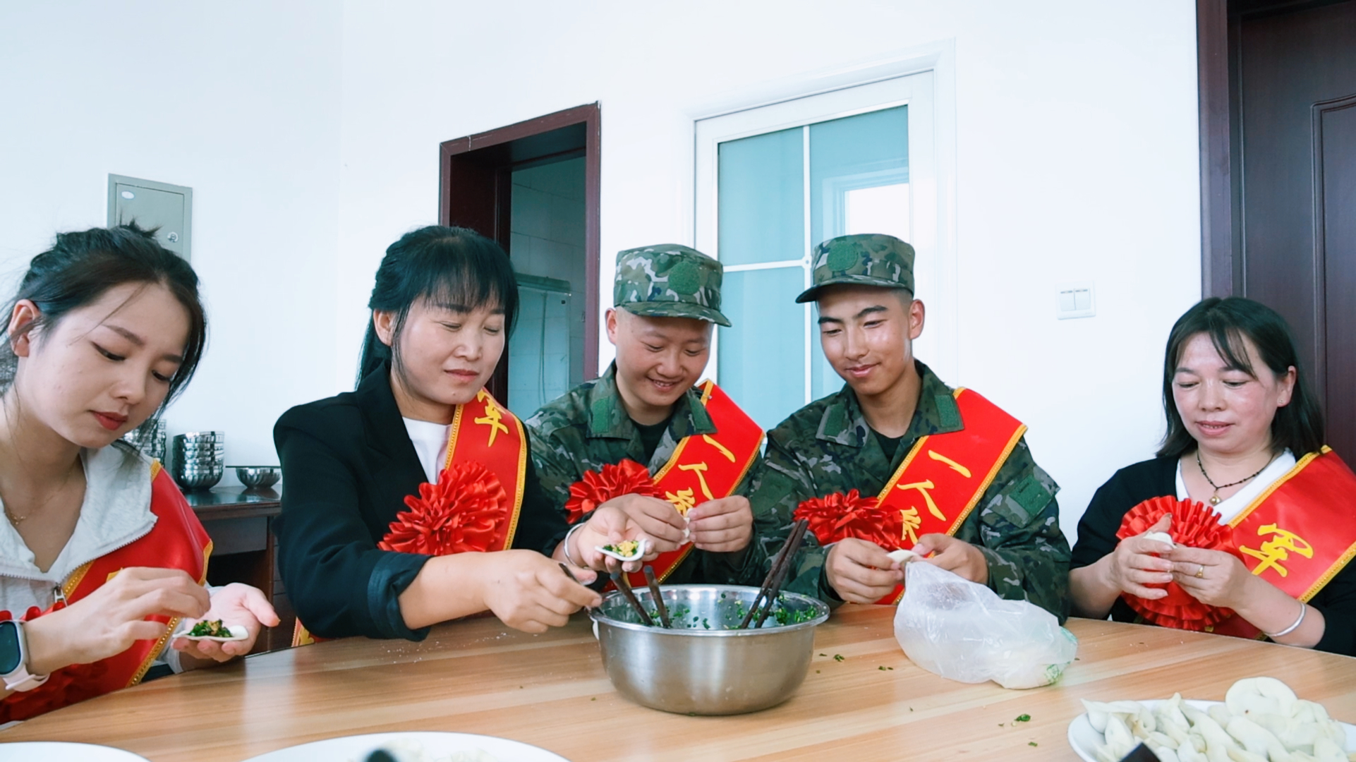 欢送仪式结束后,新兵们与家人围坐在一起,动手包饺子。一个个饱满的饺子,包裹着亲情的牵挂与家乡的味道,也承载着对未来军营生活的美好期许。