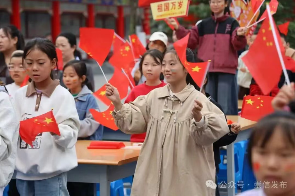 崇信县图书馆内,浓厚的节日气息扑面而来。 鲜艳的五星红旗与“祝福祖国”等标语醒目地布置在活动现场,许多家长和孩子驻足拍照留念,记录下这难忘的时刻。