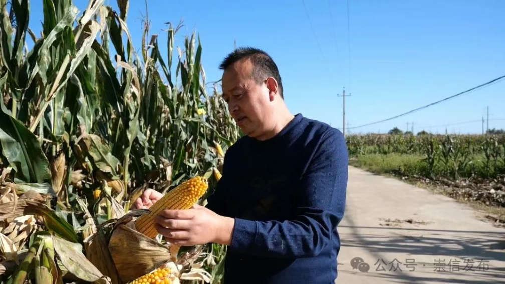 9 月 24 日,走进崇信县黄寨镇水泉洼村庙庄社的玉米试验田,玉米长势喜人,颗粒饱满。村民朱涛在自家5 亩试验田中,查看玉米长势,脸上满是丰收的期待。