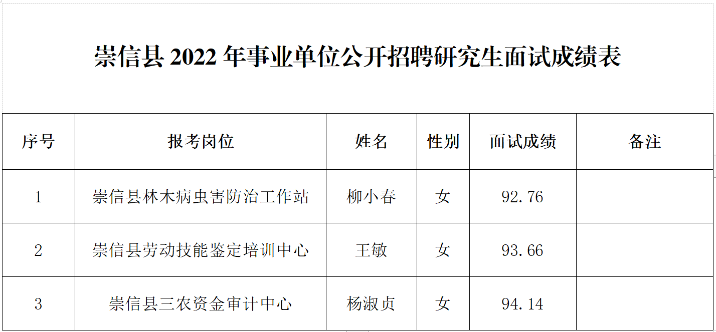 崇信县2022年事业单位公开招聘研究生面试成绩公告 浏览次数: 现将崇信县2022年事业单位公开招聘研究生面试成绩予以公告。附件:崇信县2022年事业单位公开招聘研究生面试成绩表崇信县人力资源和社会保障局 2022年7月7日 上一篇:关于2019、2020年新能源出租车运营县级财政补贴情况发放前的公示 下一篇:崇信县2021年度民办职业培训机构年检结果公示