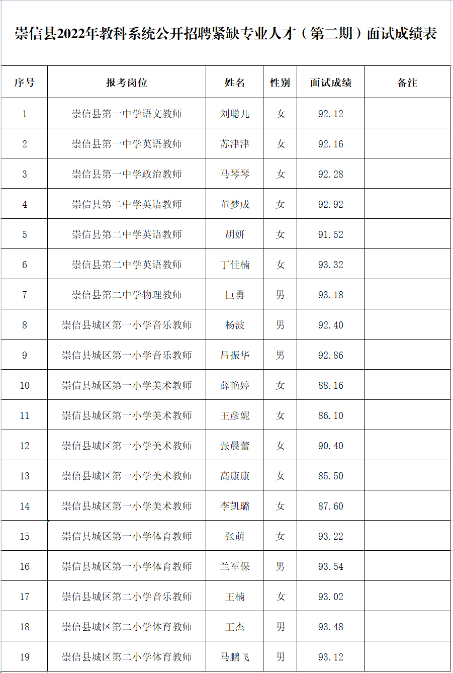 崇信县2022年教科系统公开招聘紧缺专业人才(第二期)面试成绩公告 浏览次数: 现将崇信县2022年教科系统公开招聘紧缺专业人才(第二期)面试成绩予以公告。附件:崇信县2022年教科系统公开招聘紧缺专业人才(第二期)面试成绩表崇信县人力资源和社会保障局 2022年7月5日 上一篇:关于2019、2020年新能源出租车运营县级财政补贴情况发放前的公示 下一篇:崇信县2021年度民办职业培训机构年检结果公示
