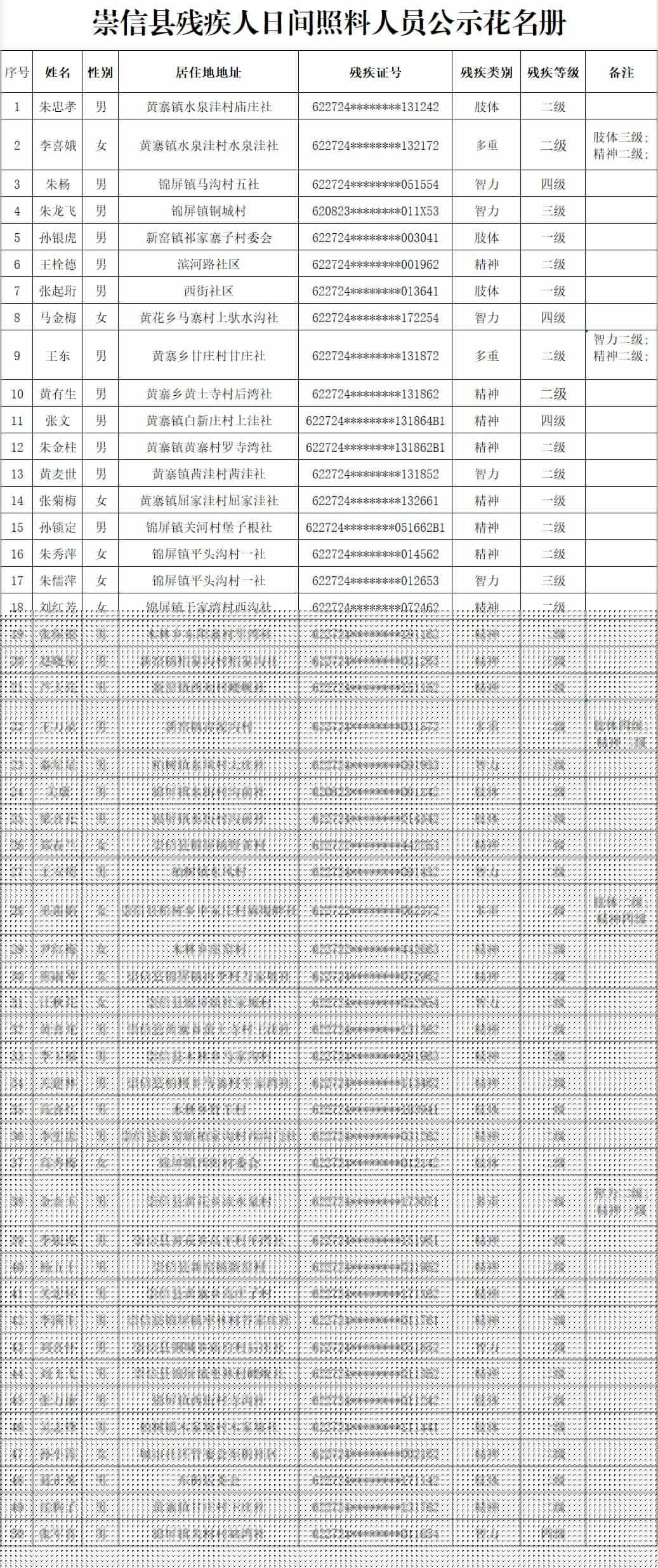 根据《平凉市人民政府<关于印发2022年市列为民办实事实施方案的通知>》要求,为加快推进我县残疾人社会保障和托养服务体系建设,切实提高残疾人托养服务能力,促进残疾人日间照料工作全面开展,确保2022年城镇重度残疾人日间照料服务项目顺利实施,对经过乡镇、城市社区摸底、第三方服务机构体检评估、县残联审核,确定的50名有照护需求的智力、精神及重度肢体残疾人进行公示,接受社会监督。如认为项目对象标准不严格、有优亲厚友等现象发生,可在公示期间向县残联反映。