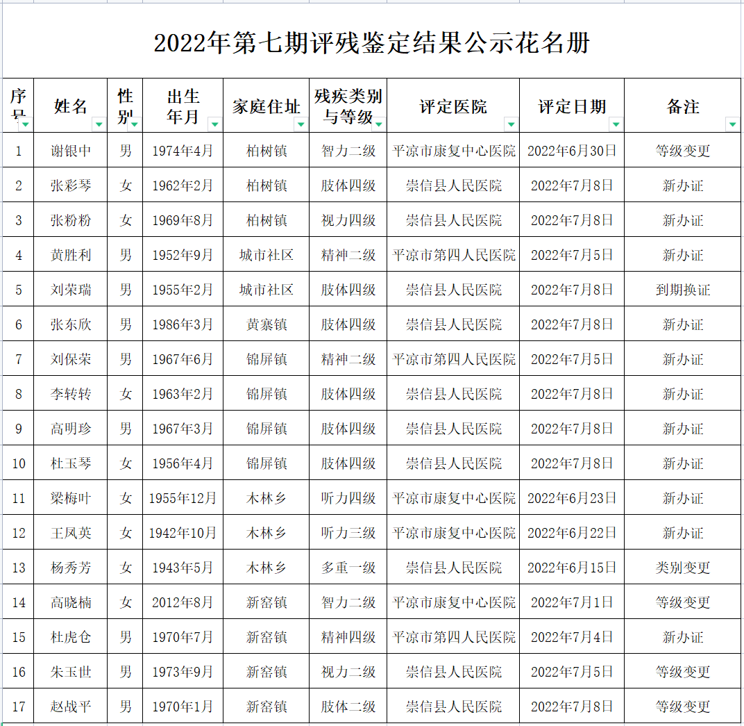 为加强对残疾人证核发工作的监督,确保残疾人证的严肃性和公信力,根据《甘肃省残疾人证管理实施办法》和《甘肃省残疾人残疾类别等级评定工作规程》规定,对经过指定医院评定且符合残疾标准的下列人员进行公示,接受社会监督。如认为公示对象不符合残疾标准,或评定过程存在弄虚作假行为,可在公示期间向县残联、县卫健局反映。