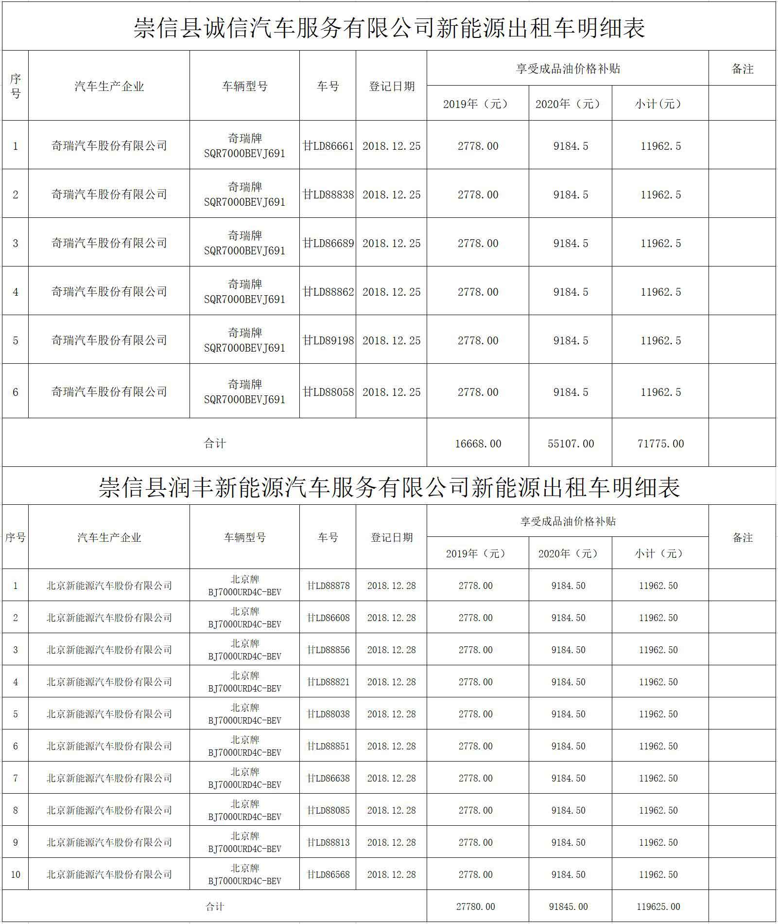 根据崇信县人民政府办公室《关于印发崇信县出租汽车经营服务管理办法的通知》崇政办发〔2019〕77号文件精神,2019、2020年度新能源出租车运营县级财政补贴明细表已经各有关道路运输企业申报,县财政局、县运管局审核,县政府常务会议通过。现予以公示: