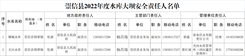崇信县2022年度小型水库大坝安全责任人名单