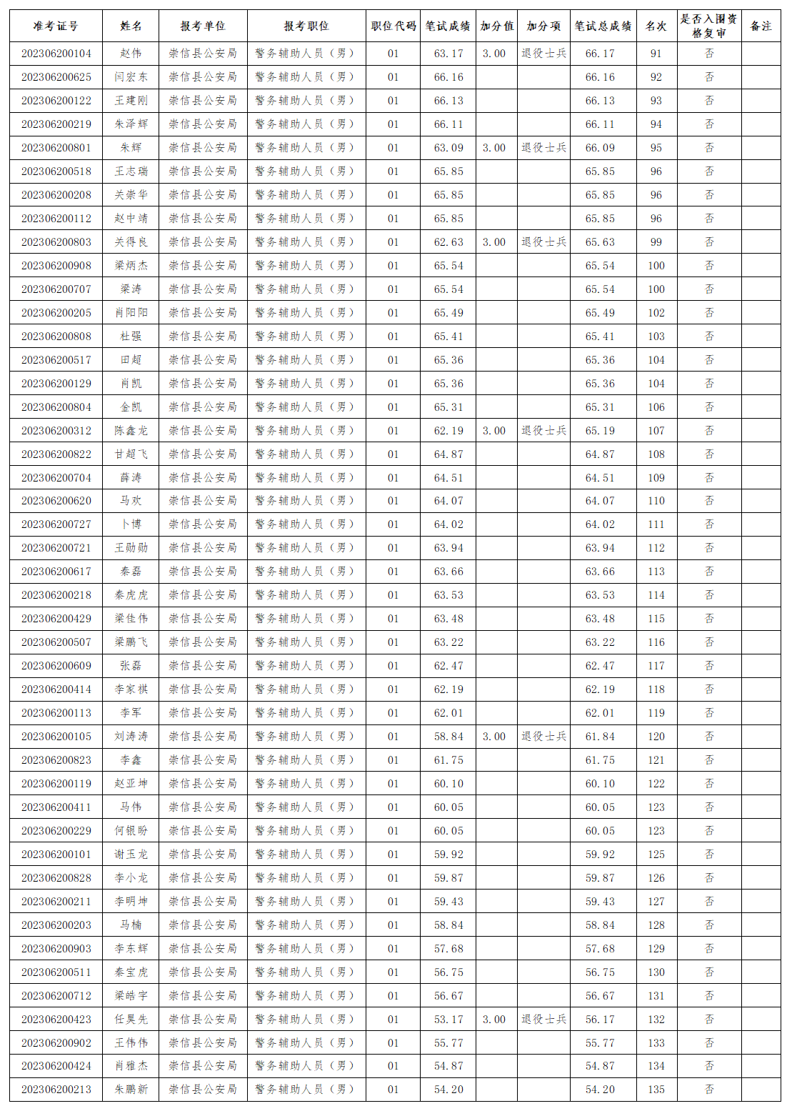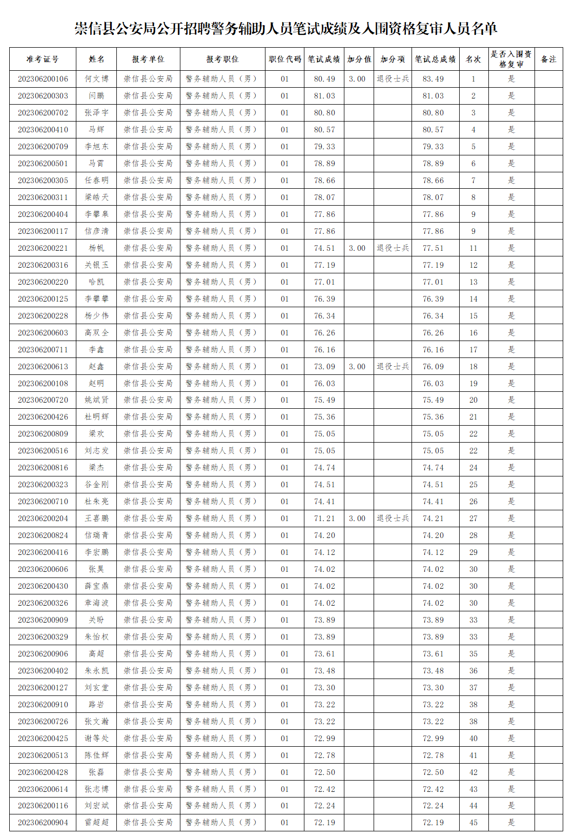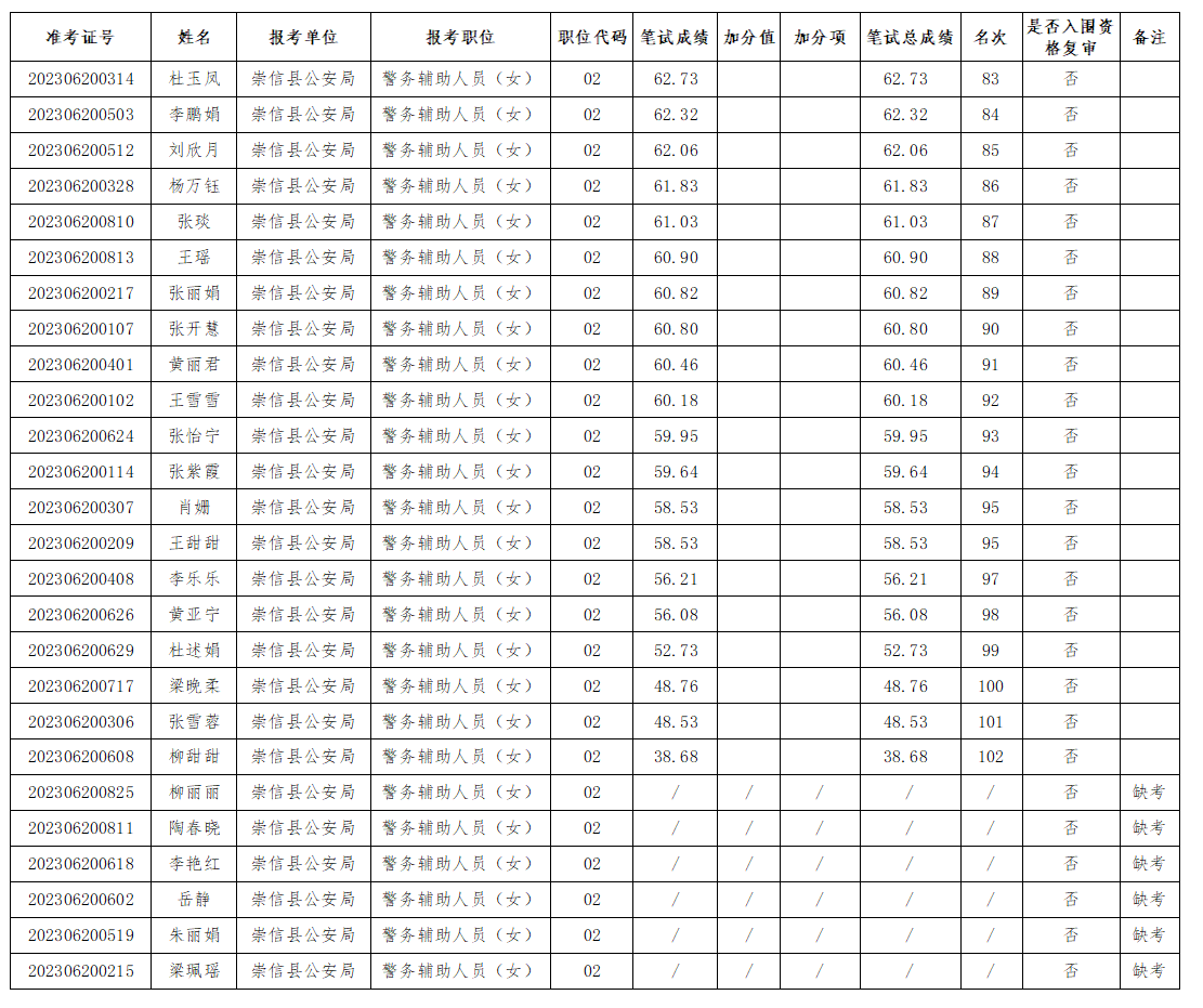 根据《崇信县公安局公开招聘警务辅助人员公告》和笔试成绩,确定进入资格复审环节报考人员(具体名单详见附件)。