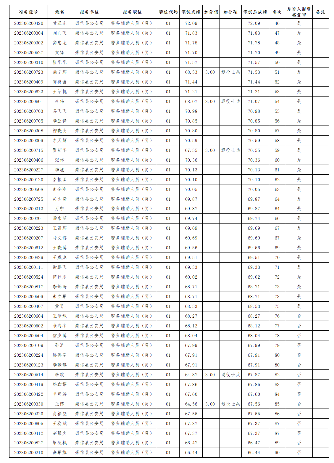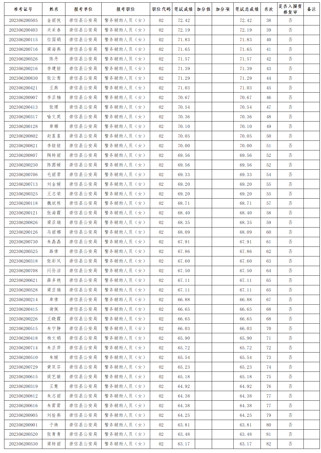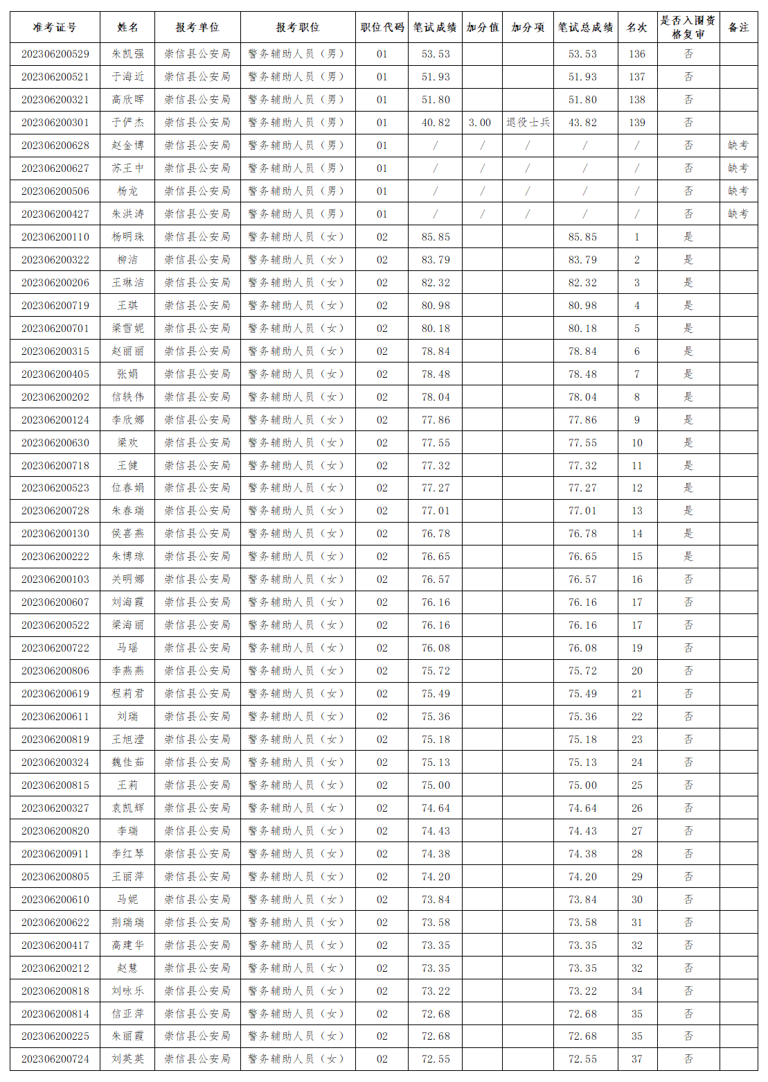 根据《崇信县公安局公开招聘警务辅助人员公告》和笔试成绩,确定进入资格复审环节报考人员(具体名单详见附件)。