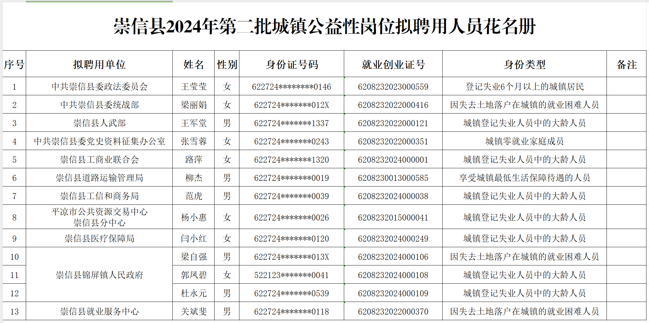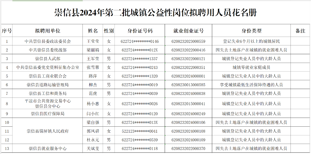 根据甘肃省财政厅、甘肃省人力资源和社会保障厅《关于印发<甘肃省就业补助资金管理办法>的通知》(甘财社〔2018〕67号)、《关于进一步加强和规范公益性岗位开发管理工作的通知》(甘人社通〔2020〕126号)和《关于进一步加强和规范公益性岗位开发管理工作的通知》(崇人社发〔2020〕184号)等文件规定,经发布招聘公告,用人单位组织报名和确定初步人选,县人社局审核同意,现就崇信县2024年第二批城镇公益性岗位拟聘用人员予以公示,接受社会各界监督。
