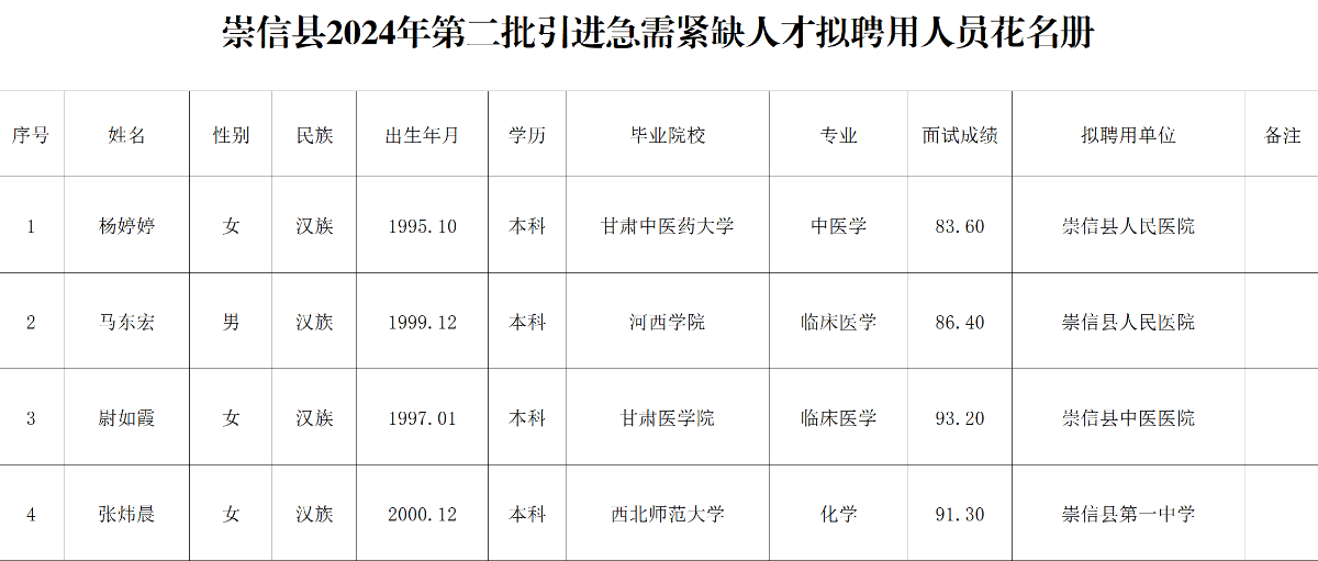 附件:崇信县2024年第二批引进急需紧缺人才拟聘用人员花名册