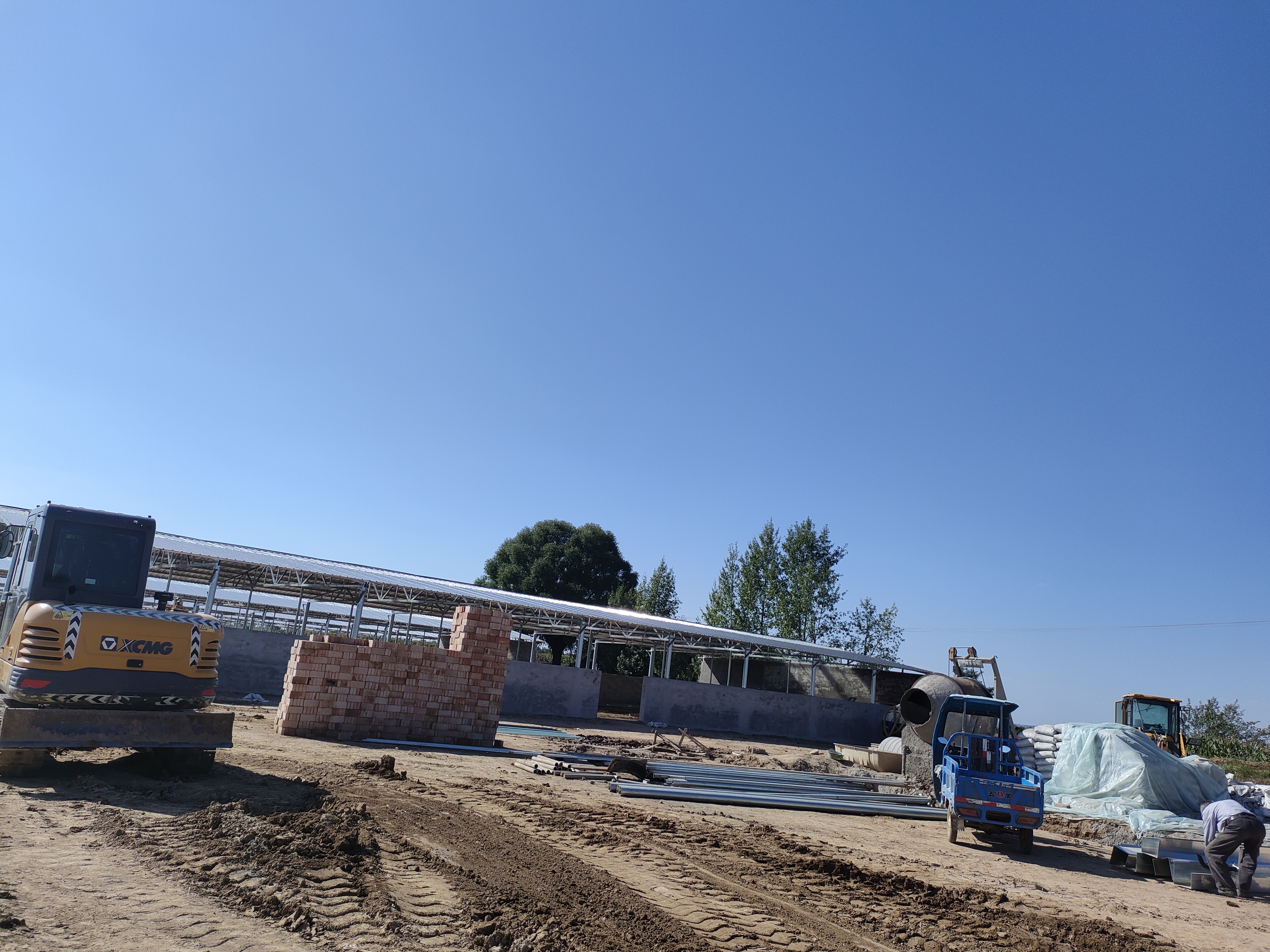 深秋之际、云淡天蓝,柏树镇富通公司优质肉牛养殖小区的建筑工地上,机器轰鸣、车来人往。林立的钢柱下、成排的铁架里,切割机飞旋、电焊枪放光……装载机往返于搅拌机与工区之间,工人们操作机器、推车挥锹干得热火朝天。而在另一边已建成的牛棚里百余头牛沐浴于暖阳之中,或伸头舔槽饮水、或躺卧地上伸腰舔皮毛,更有成群站立悠闲自在甩尾者,一个个膘肥体大,毛色鲜亮。